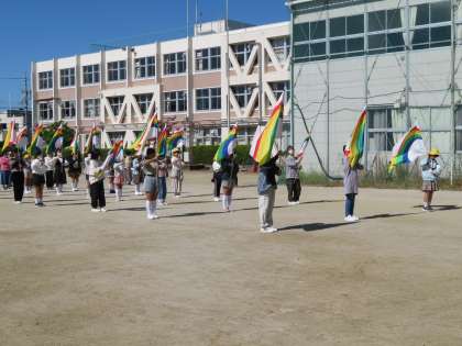出場する金管部とカラーガード部の出発前の練習風景です。