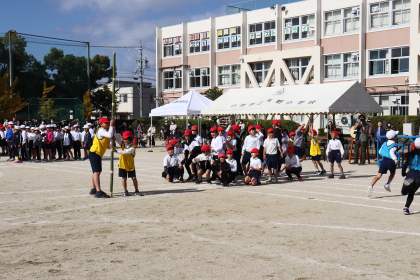 4人でカラーコーンを回り、クラスメイトの足の下を通してから頭の上を通して次のグループに竹の棒を渡します。見ているよりも大変そうでしたが、友達と息を合わせて頑張る姿が見られました。
