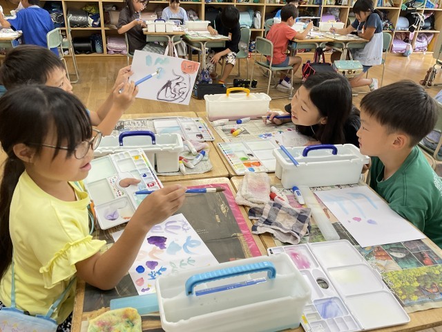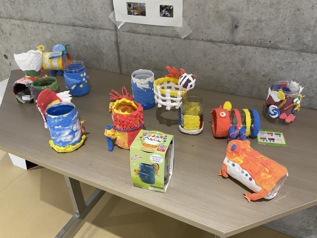 「空き容器のへんしん」では、持ってきた容器に紙粘土をつけ、好きなものに変身させていきます。どんなものに変身させるか、白い紙粘土にどんな色をつけるかを前時に計画したので、今日はつけたい色を試しに作っていました。