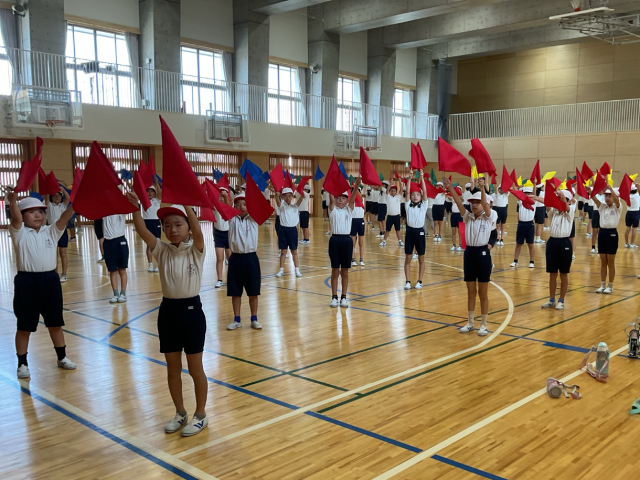 5時間目、運動場では3年生、体育館では4年生が運動会の練習をしていました。
