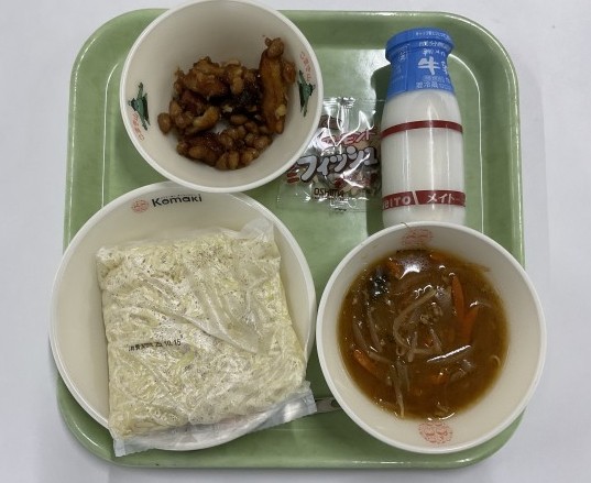 本日の献立は、中華めん、牛乳、ごまみそタンタンめん、さつまいもと大豆のかりんとう、アーモンド入り小魚、でした。