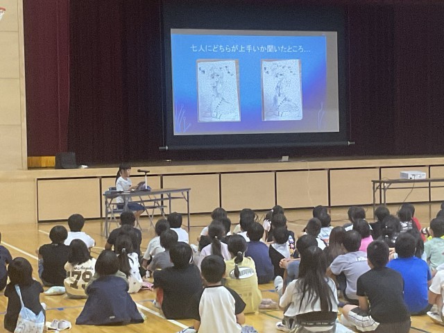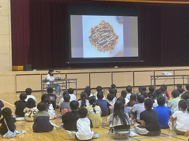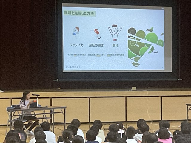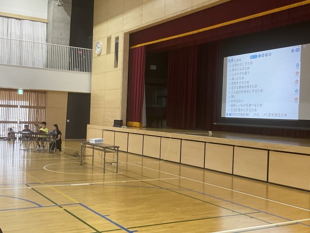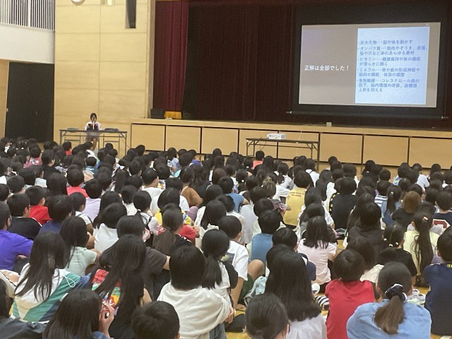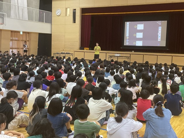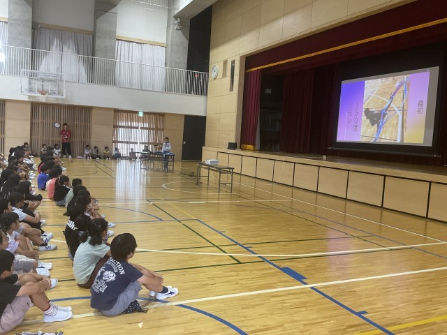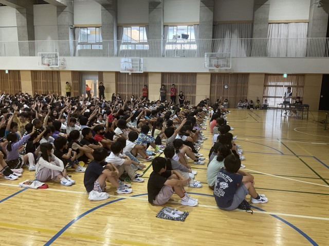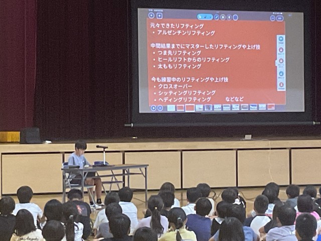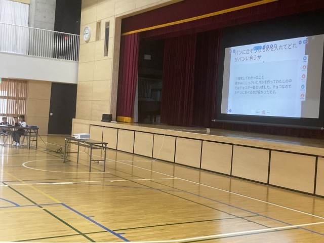6時間目に3~6年生が体育館に集まり、4~6年生がこれまで取り組んできたMy探究について、代表児童の発表をききました。