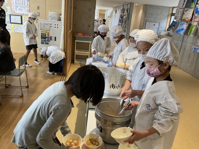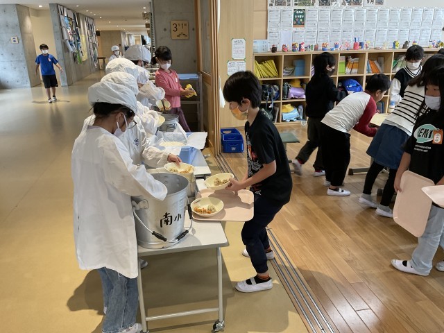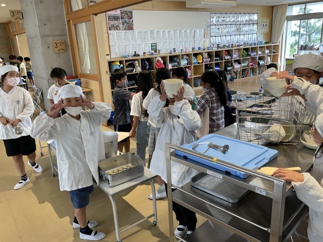 3年生の教室では、給食当番がてきぱきと準備していました。どのクラスも身なりをきちんと整えていて感心しました。