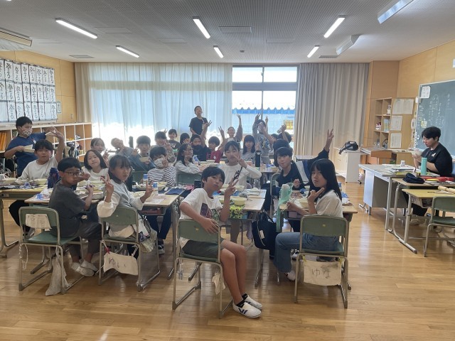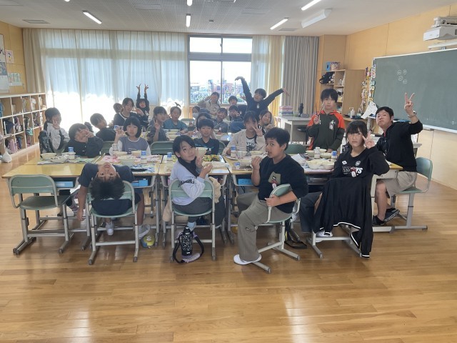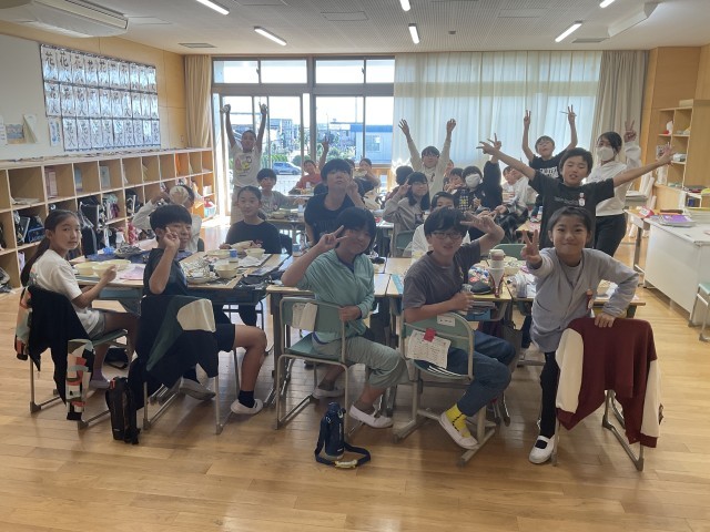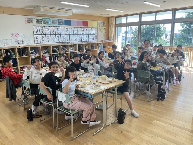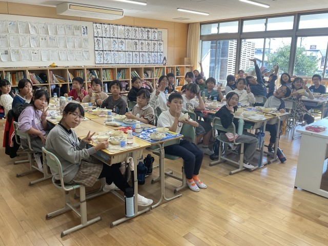 5年生の教室におじゃますると、机を向かい合わせて和気あいあいと会食中。