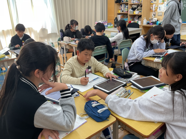 5年生の他の教室では、社会科で日本の工業生産の課題について考えていました。