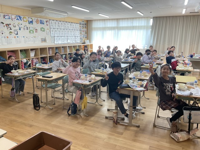 5年生の教室にお邪魔したら、おいしくいただいたり、おかわりをしたりする真っ最中でした。