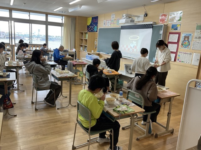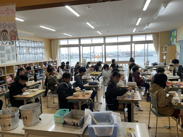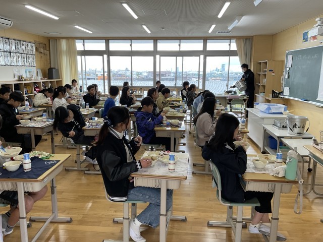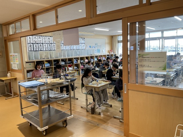 本日の献立は、ごはん、牛乳、名古屋コーチン入りひきずり、おから入りハンバーグの和風ソースかけ、海そうサラダ、でした。