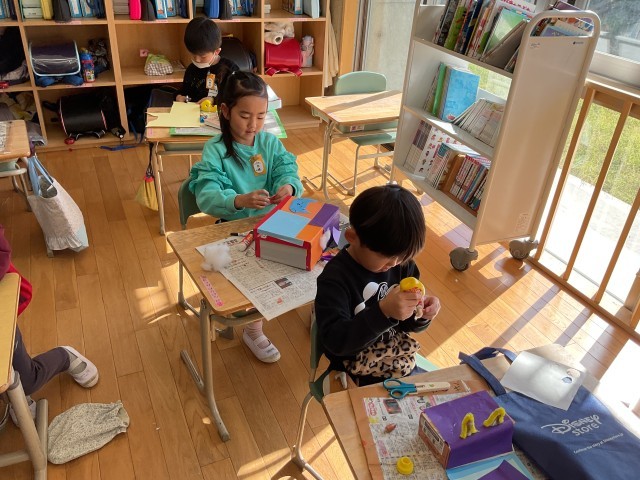 運動場で拾った落ち葉を使って、季節を感じる箱をつくっている子もいました。