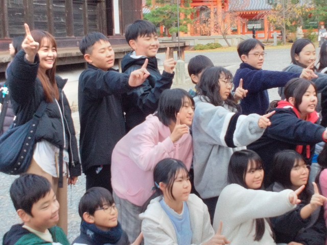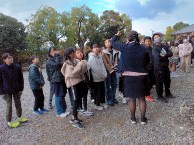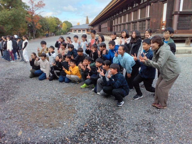 三十三間堂では、1,000体の千手観音立像を見ました。観音像1体1体の表情が違うことに興味をもち、熱心に見ることができました。