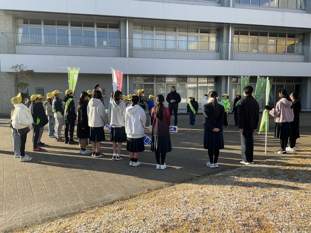 「地域と仲を深めよう」と、応時中学校の生徒会のみなさんが来てくれて、生活委員と一緒に校門や昇降口前であいさつを呼びかけました。