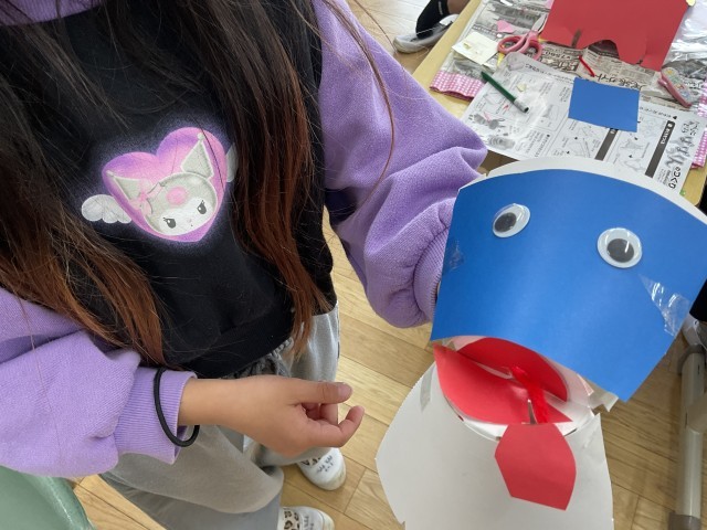 切って顔の形を変えたり、紙を貼って好きな色をつけたり、飾りをつけたり、舌の形を工夫したりと、自分だけのぱくぱっくんが完成していきました。