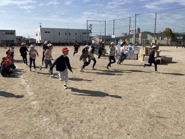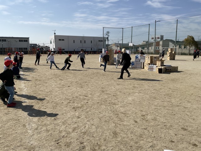 ダンボールの置かれた逃走エリアに低学年・高学年ごとに入り、マスターの合図でハンターが放出されてゲーム開始。