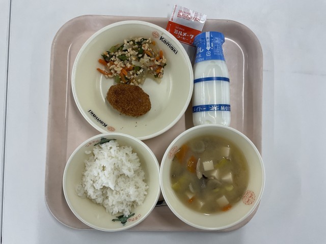 本日の献立は、ごはん、牛乳、スキー汁、コーンフライ、きりざい、コーヒー牛乳のもと、でした。