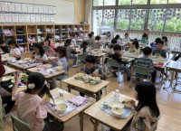 2年生の教室におじゃますると、みんなで楽しく会食の真っ最中。