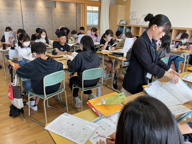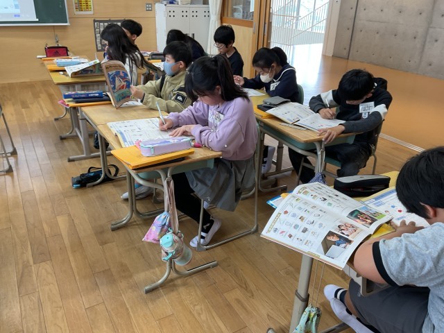 外国語の時間では、英語を使って自分の宝物について紹介し合いました。fromの使い方も学び、伝え方の幅を広げながら楽しく交流しました。