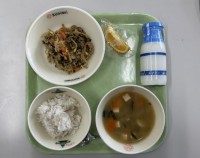 <本日の献立> ごはん 牛乳 鉄火みそ 愛知の五目厚焼き卵 ほうれんそうの彩りあえ