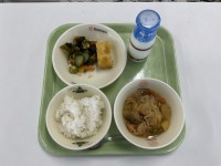<本日の献立> 麦ごはん 牛乳 ワンタンスープ ビビンバ みかん