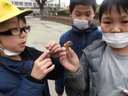 今年の冬は暖かったので、草木が芽を出すのが早いです。ふきのとうやつくしなど、たくさん探すことができました。動いているダンゴムシも見つけました。なぜかセミの抜け殻まで発見し、驚いていました。