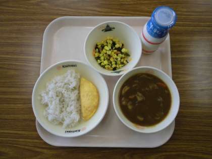 麦ごはん 牛乳 チキンカレー オムレツ コーンソテー