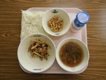 <本日の献立> 中華めん 牛乳 しょうゆラーメン 鶏肉の中華炒め さつまいものあめがらめ