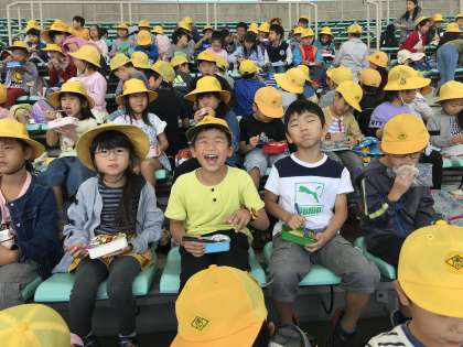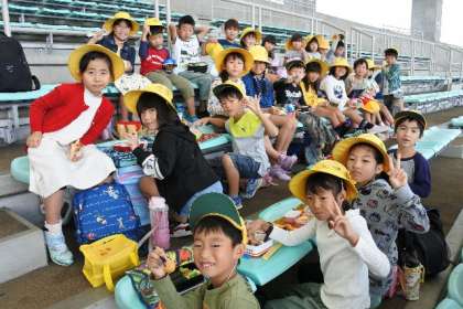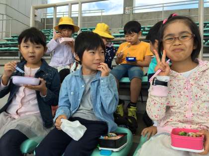 イルカショーを見る場所でお弁当を食べました。どのクラスもおいしそうにお弁当を食べながら、イルカショーが始まるのを待っていました。