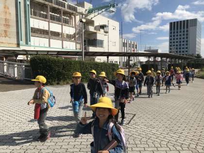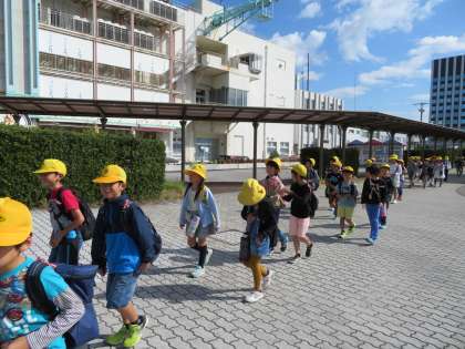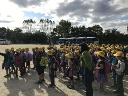校舎に向かって「行ってきまーす。」の挨拶。賑やかなバスを降りて、名古屋港に到着。「どんな海の生き物がいるのかな。」「イルカショーが、楽しみ。」「グループ行動はどこに行こうか。」みんなワクワクしながら水族館に向かいます。
