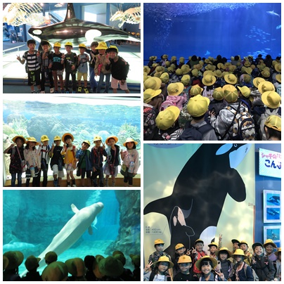大きなシャチやかわいいベルーガ、マイワシの群れ…魅力的な生き物に見入っていました。グループのみんなが離れ離れにならないように気をつけたり、時間を守ったりしてグループ行動もがんばっていました。