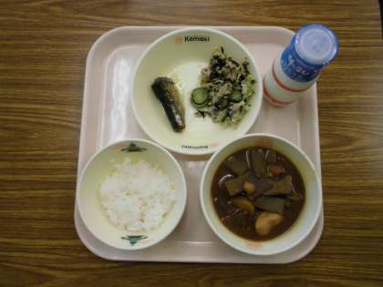 <本日の献立> ごはん 牛乳 みそおでん いわしのしょうが煮 キャベツのレモンサラダ