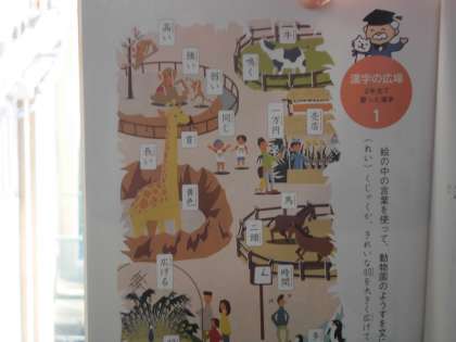 国語の教科書32ページ、33ページをひらいてみましょう。動物園の絵の中に2年生までにならった漢字がのっていますね。絵の中の言葉を使って、動物園のようすを文に書いてみましょう。主語、じゅつ語を使って文が作れるといいですね。