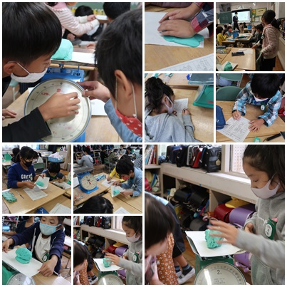 はかりでねん土の重さをはかってみる。