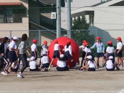 1〜6年までを赤・白に分けて、それぞれの大玉送りのタイムを合計します。どれだけ協力やつながりが深まるか、今日は2分58秒でした。さて、11月4日には・・・。