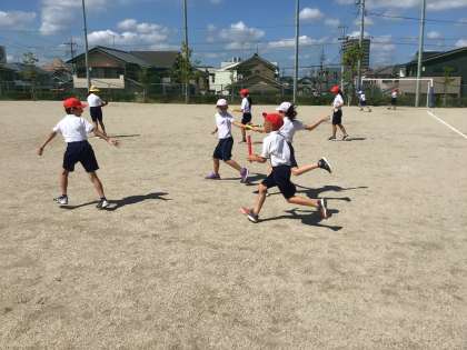 リレーの練習をしました。バトンをどのように渡すか考えました。