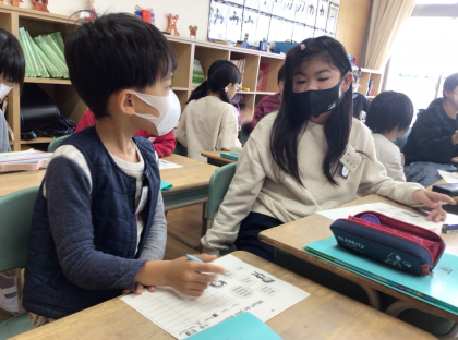 形の言い表し方を学習しました。形を体で表現しながら発音したり、欲しい形を尋ねたり答えたりして、楽しみながら英語に慣れ親しみました。