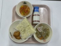 本日の献立は、中華めん、牛乳、塩ラーメン、豆腐ナゲット、フルーツゼリーあえ、でし...