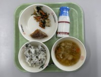 本日の献立は、ごはん、牛乳、呉汁、くろだいごまソース、ひじきのいため煮、でした。...