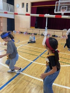 みちくさ広場で「みちくさ運動会」がありました。体育館に移動してはちまきを巻き...