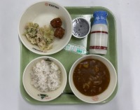 本日の献立は、麦ごはん、牛乳、カレーライス、愛知の食材入り肉団子、ツナサラダ、小...