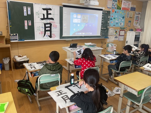 少し早いですが「正月」という字を書きました。「つり」「ビル」と来て、漢字二文字...