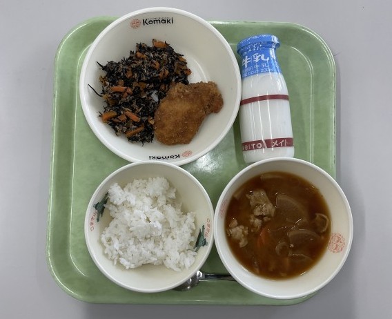 本日の献立は、ごはん、牛乳、呉汁、くろだいごまソース、ひじきのいため煮、でした。...
