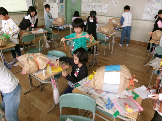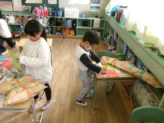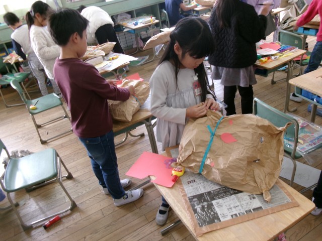 紙をくしゃくしゃにしてできる形を見つけ、形を変えながら表したいものを考えます。