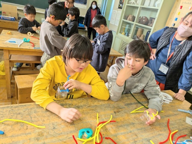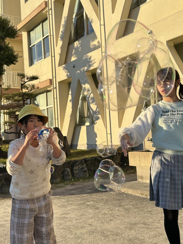 プラスチックチェーンや麻ひもなどを使い、大量にしゃぼん玉をとばし、子どもたちは喜んでいました。