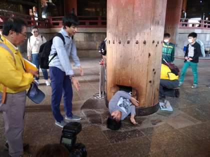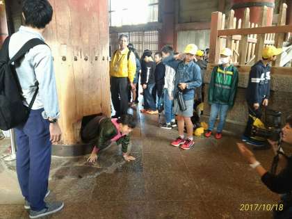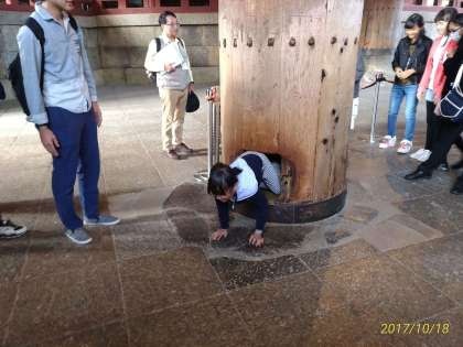楽しみにしていた、穴くぐり。この柱の穴、大仏の何の穴と同じ大きさでしょう?