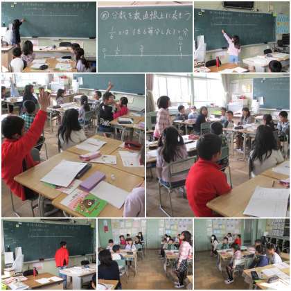 今日の算数のめあては、「分数を数直線上に表そう」でした。