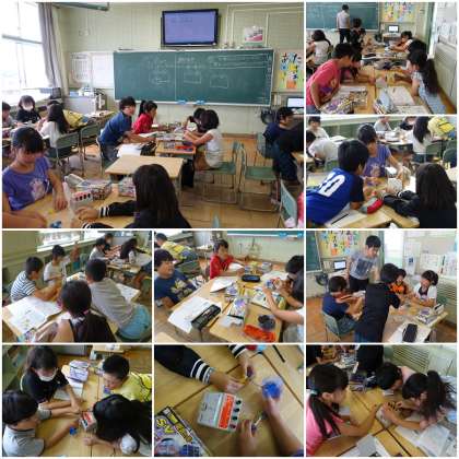 4年生は今電気について勉強をしていますが、今日は乾電池を複数個使ったときの、「直列つなぎ」と「並列つなぎ」の違いについて、電流計やモーターを使って確かめていました。