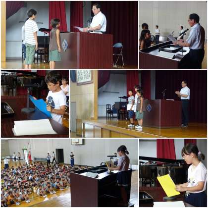 校長先生からは「つながり」「進化した自分」についての話があり、野村克也さんの「失敗と書いてせいちょうと読む」というお話しがありました。人は失敗するたびに成長していきます。また、失敗があるということは、何かに挑戦し続けているという証拠となるわけです。学校で学習している全てのことが挑戦の連続なのです。この1学期で全ての子どもたちが大きく成長しているのは間違いありません。
