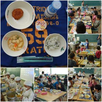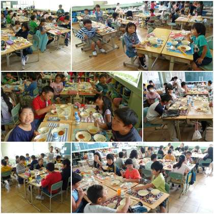 2日ぶりの全学年がそろっての給食でしたが、いつもと同じようにおいしくいただきました。今日中学校で出された、小中入れ替えメニューの「栗入り五目ごはん」が楽しみです。来週の月曜日は休まないようにしましよう!