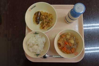 今日の給食の献立は、はるか昔から日本の主食である「ごはん」、一見肉じゃがだと思わせておいての「じゃがいものそぼろ煮」、骨までやわらかく健康にもいい「いわしの梅煮」、おかかの風味がたまらない「野菜のおかかあえ」、そして毎日1本「牛乳でした。今日は各教室を回ることはできませんでしたが、きっといつものように「おいしいでーす!」と言っていたに違いありません。
