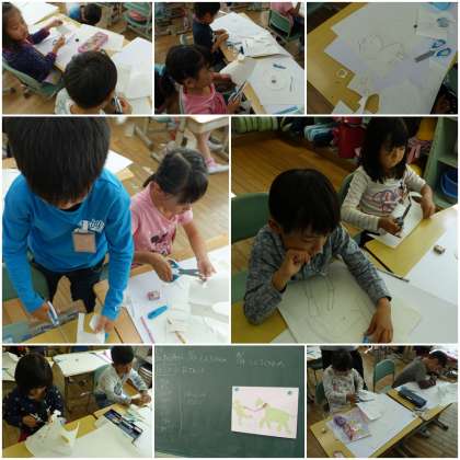 今日は、明日行われる図工競技会に向けて作品の構想と試作品づくりをしていました。作品の中には、自分と一緒に散歩する動物が必ず描かれていなければなりません。以前運動会の絵を棒人間にならにように、複数のパーツ使って表現したように、今回も人と動物のパーツを作って組み合わせます。さあ、動物園で観察したり、図鑑で調べたりしたお気に入りの動物を、動きがあるように表現できるでしょうか。