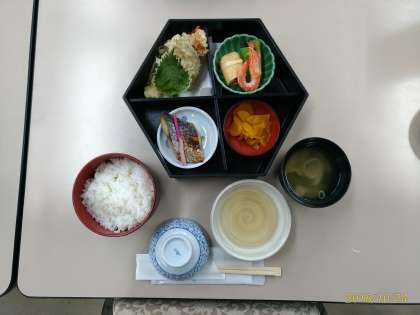 昼食場所の西陣織り会館に到着しました。朝が早かったのでお腹がペコペコ。メニューは、和風弁当です。天ぷら、焼き魚、煮ものおつけもの。みんなおいしそうに食べていました。