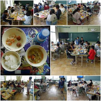 今日の給食の献立はそろそろ新米も出回る「ごはん」、多分初登場だと思われる子どもにはほどよい甘さがたまらない「さつまいもの和風スープ」、あまると必ず争奪ジャンケン大会が行われる「ごぼう入りつくね」、家でもぜひ作ってほしい思っていた以上に人気のあった「もやしとたくあんの即席漬け」、そしてなぜか「もやしとたくあんの即席漬け」を食べながら飲んでもおいしい「牛乳」でした。